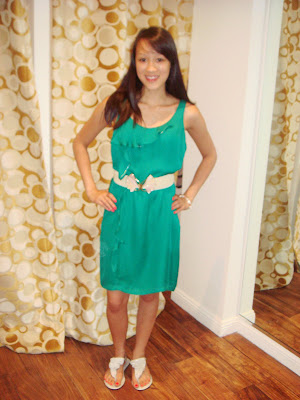 Beautiful emerald green dress with a ruffle from the top to the side.. dress it up with a cute butterfly belt and you're good to go!